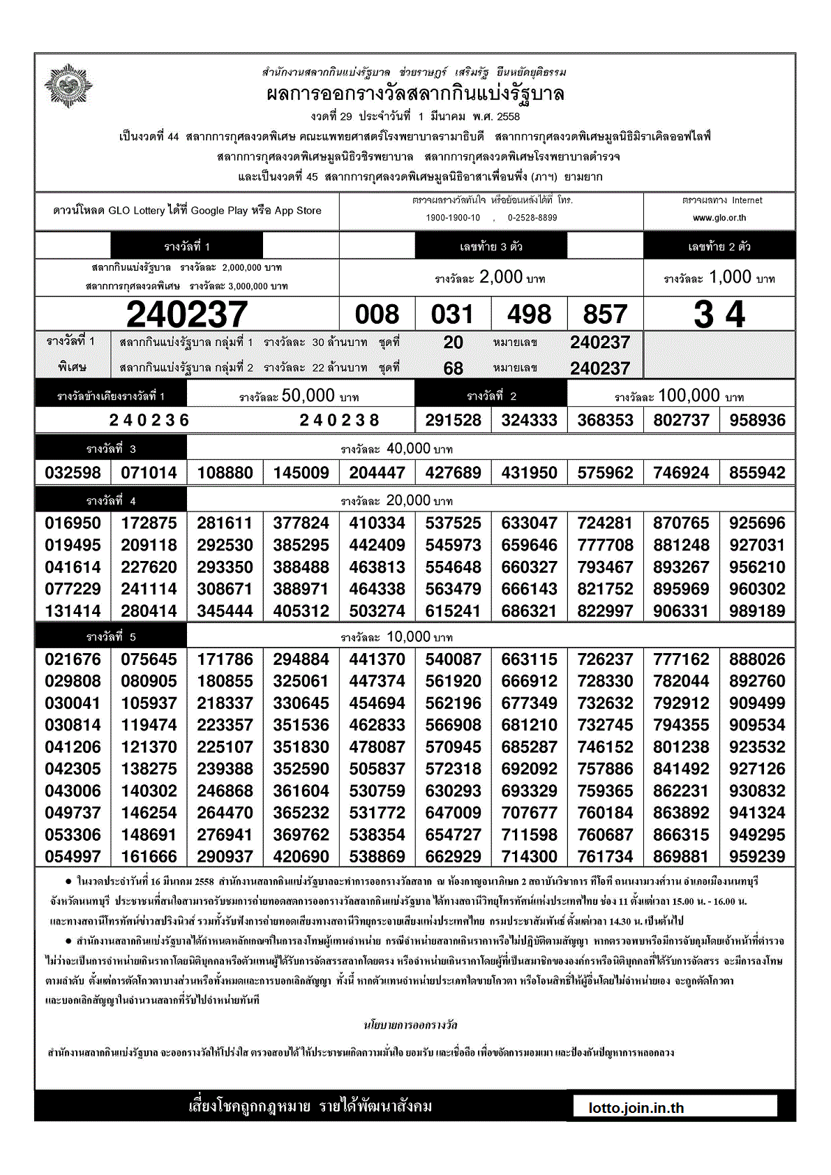 | 01 มีนาคม 2558 | ใบตรวจหวย | 240237 | 008 031 498 857 | 34 |