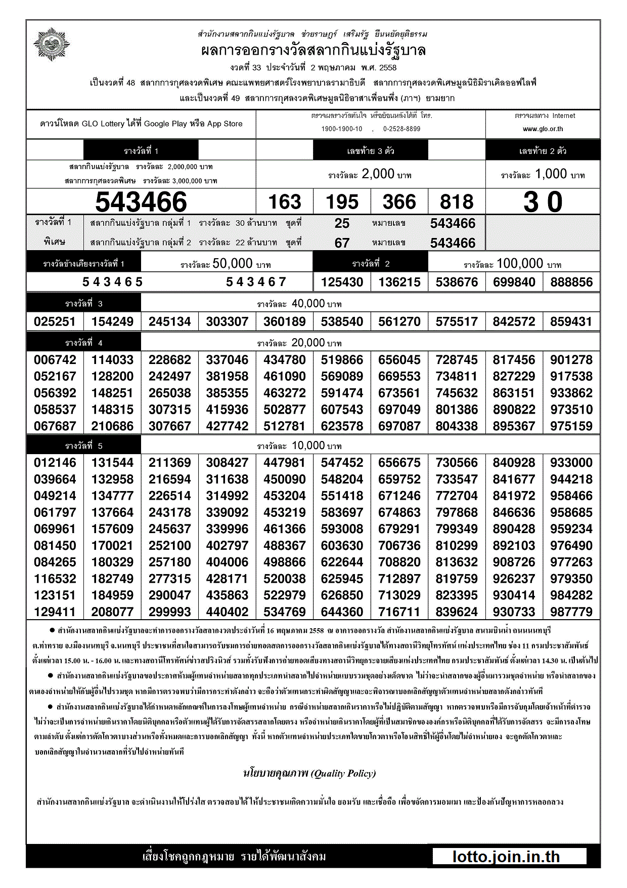 | 02 พฤษภาคม 2558 | ใบตรวจหวย | 543466 | 163 195 366 818 | 30 |
