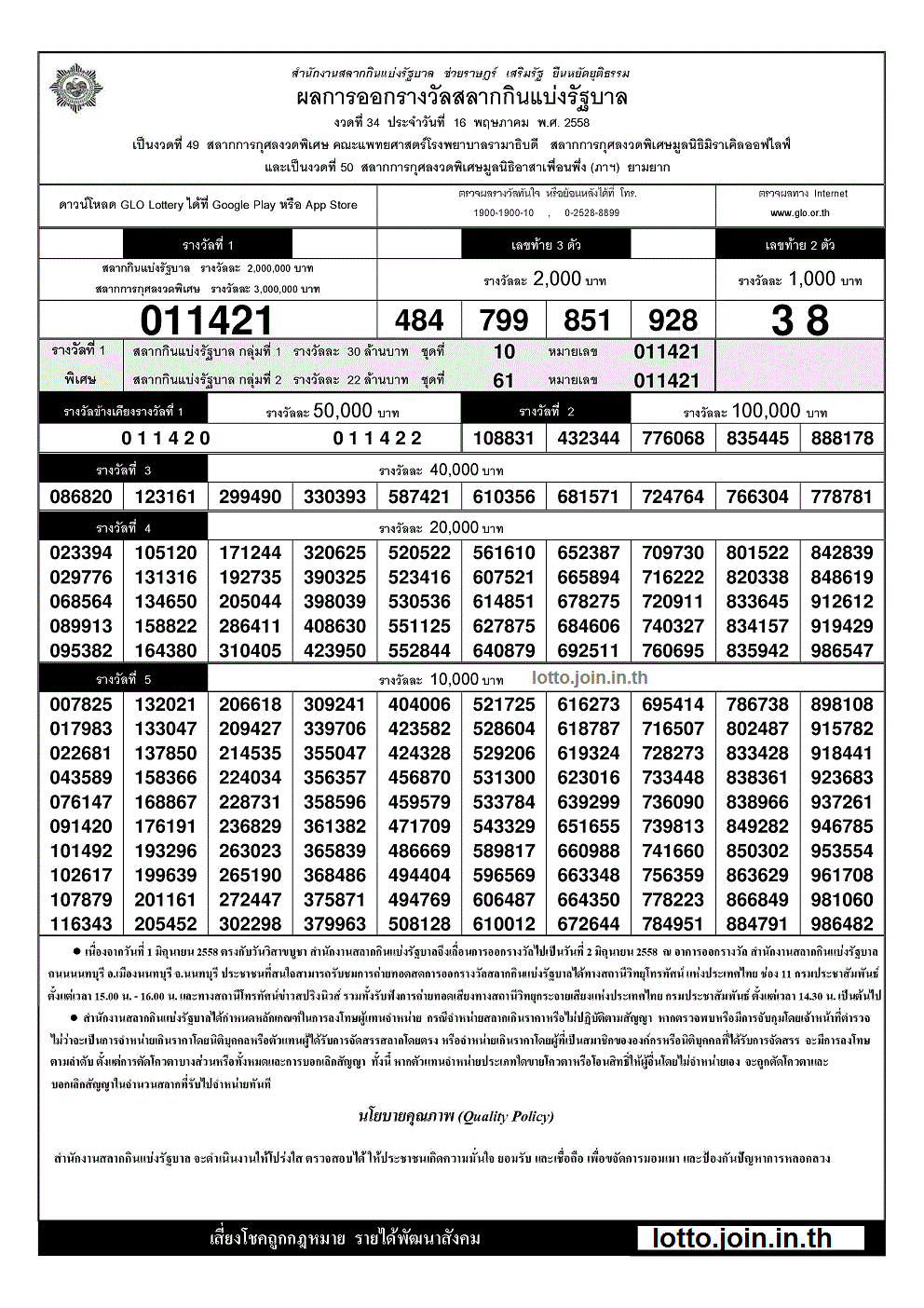 | 16 พฤษภาคม 2558 | ใบตรวจหวย | 011421 | 799 484 851 928 | 38 |