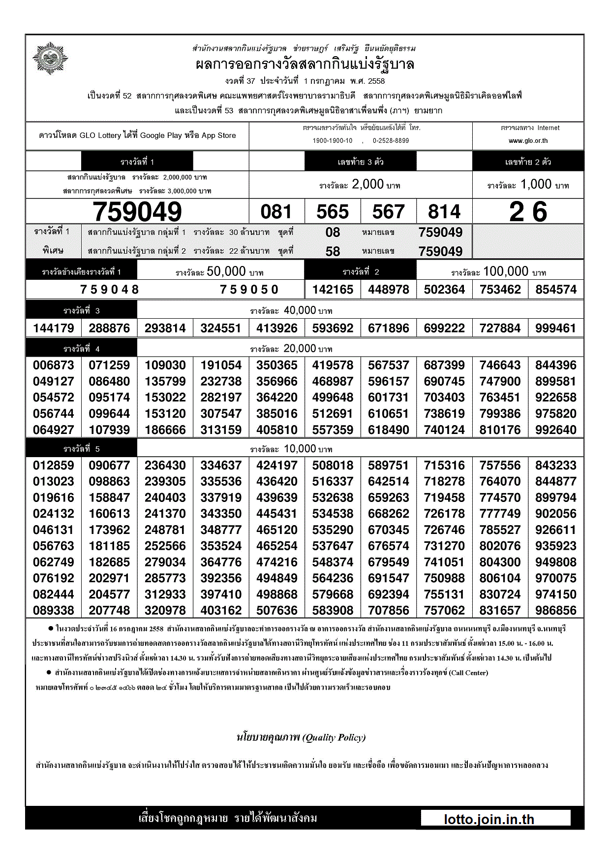 ชื่อเรื่อง:เว็บบริการตรวจผลสลากกินแบ่งรัฐบาลออนไลน์ งวดประจำวันที่ 01/7/58 ตรวจหวย เลขที่ออก 01/07/58