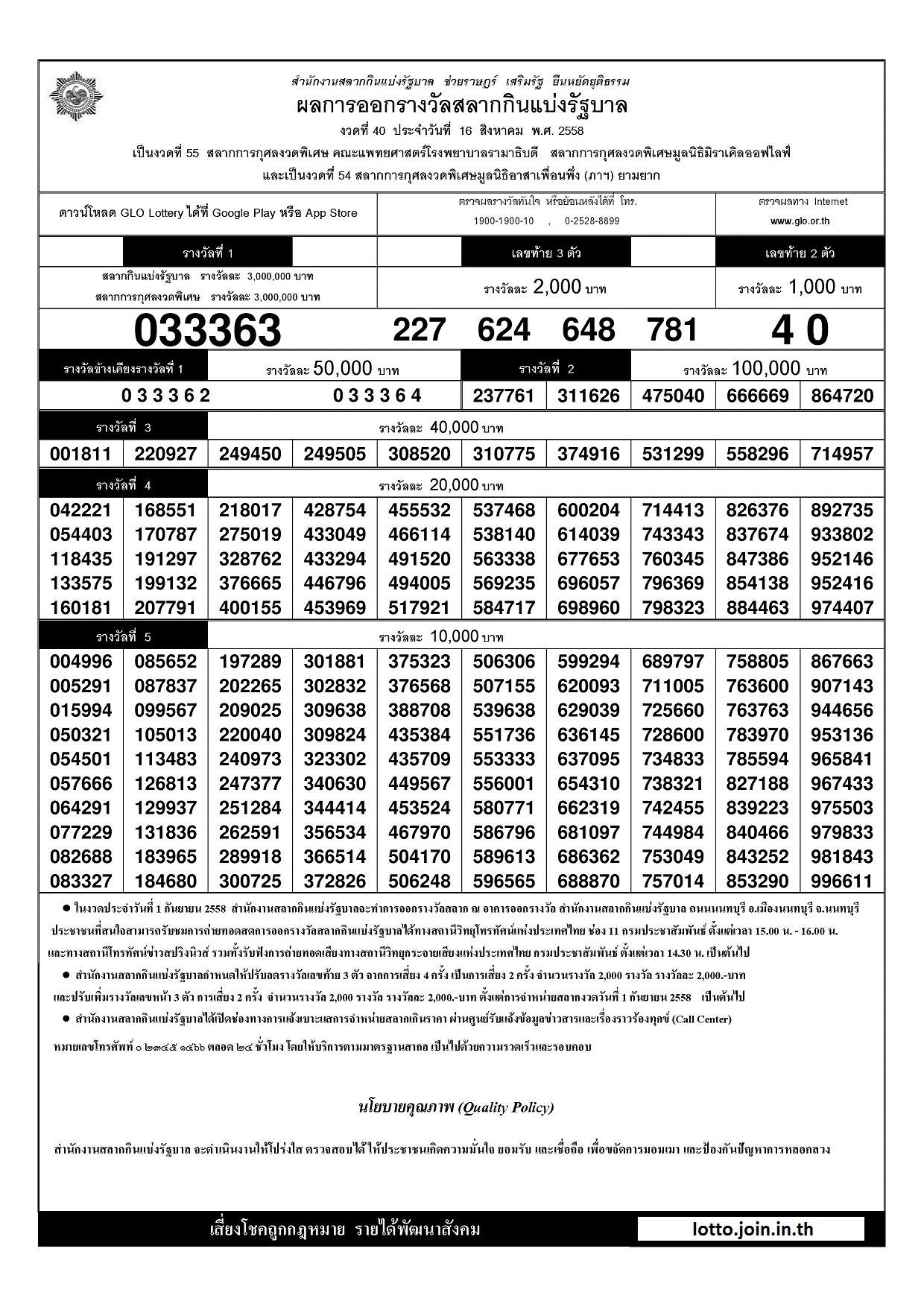 | 16 สิงหาคม 2558 | ใบตรวจหวย | |||