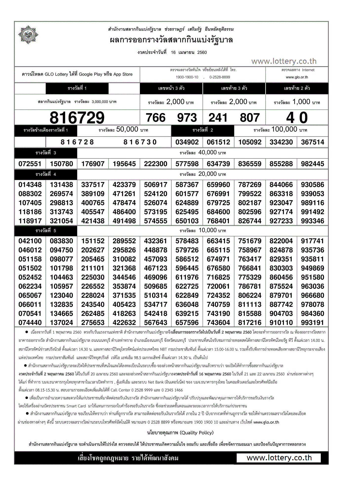 | 16 เมษายน 2560 | ใบตรวจหวย | 816729 | 241 807 | 40 | 766 973 |