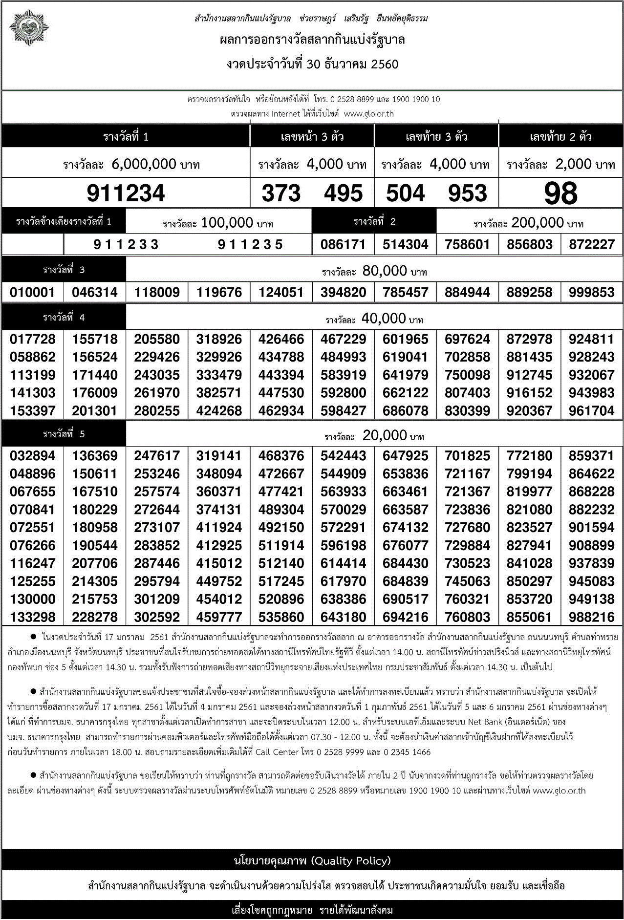 | 30 ธันวาคม 2560 | ใบตรวจหวย | 911234 | 953 504 | 98 | 495 373 |