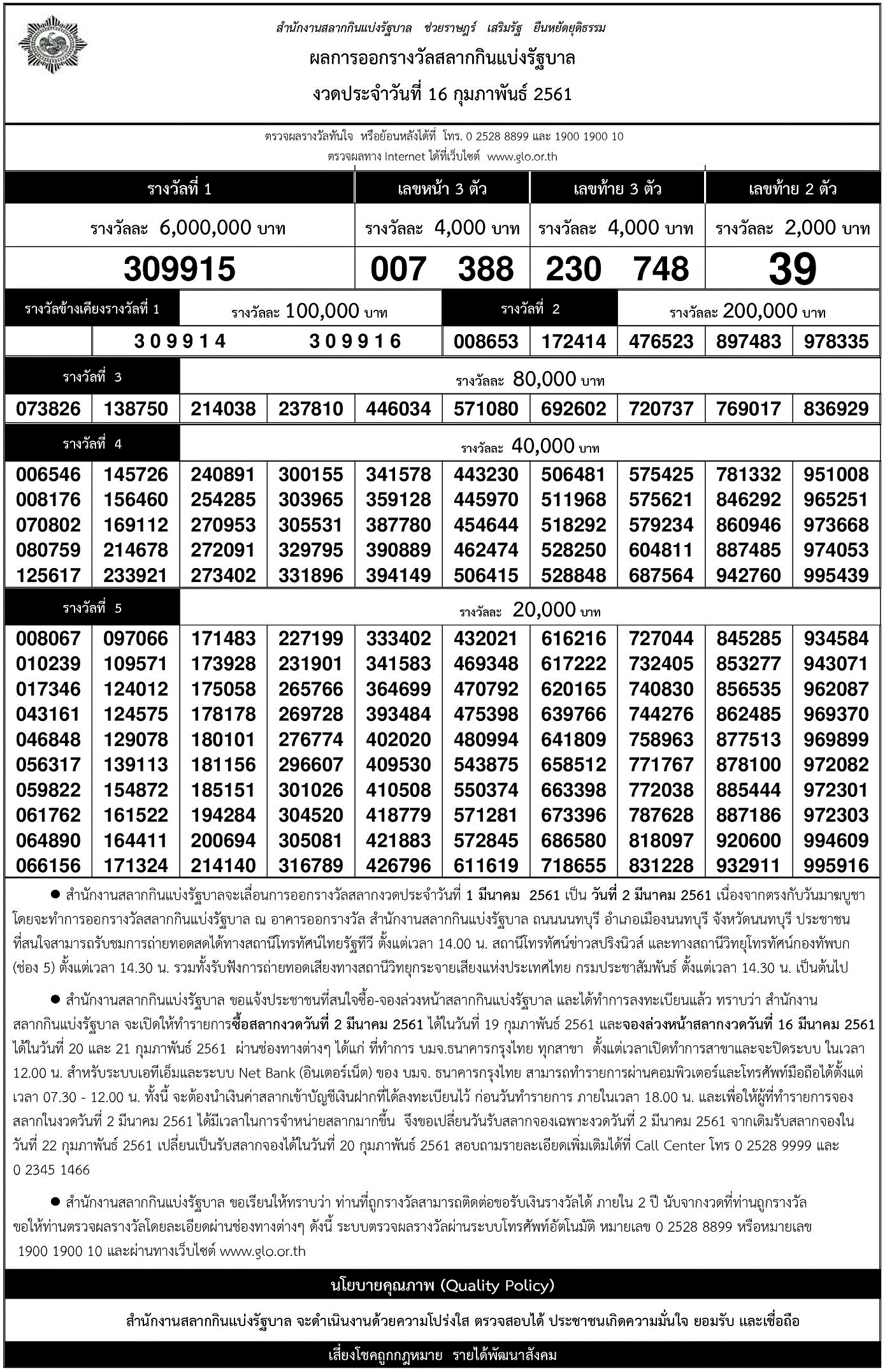 | 16 กุมภาพันธ์ 2561 | ใบตรวจหวย | 309915 | 230 748 | 39 | 007 388 |