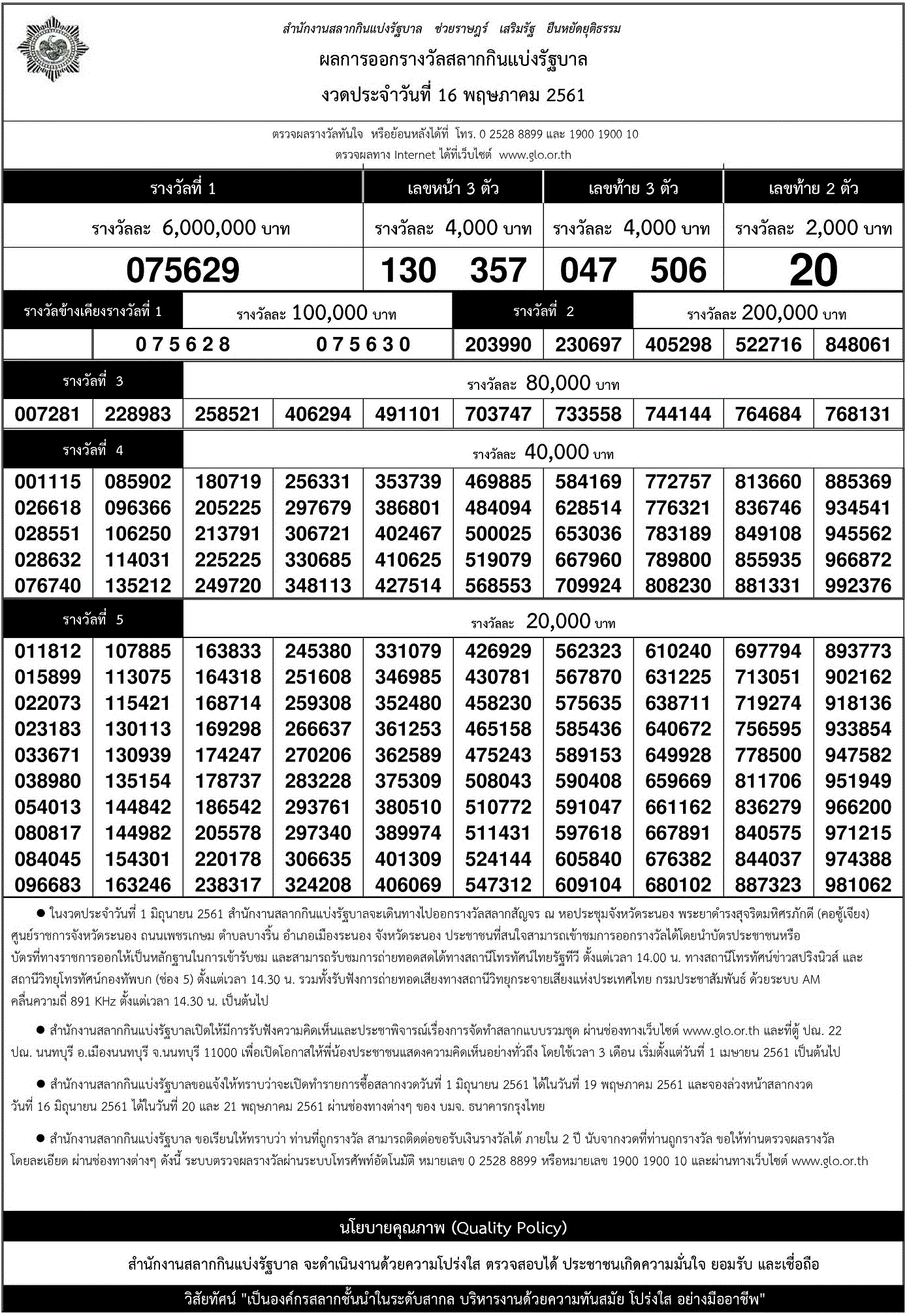 | 16 พฤษภาคม 2561 | ใบตรวจหวย | 075629 | 506 047 | 20 | 130 357 |