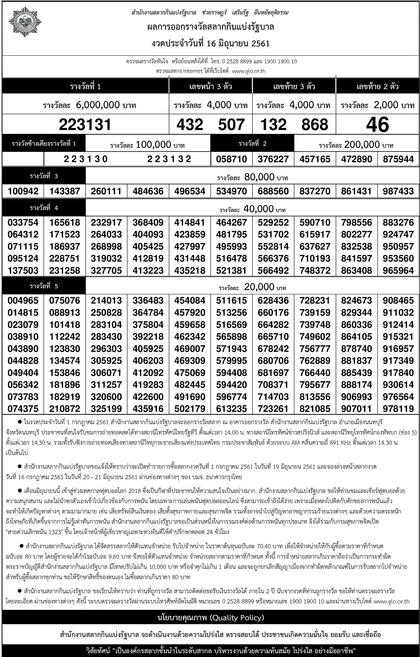 | 16 มิถุนายน 2561 | ใบตรวจหวย | 223131 | 132 868 | 46 | 432 507 |