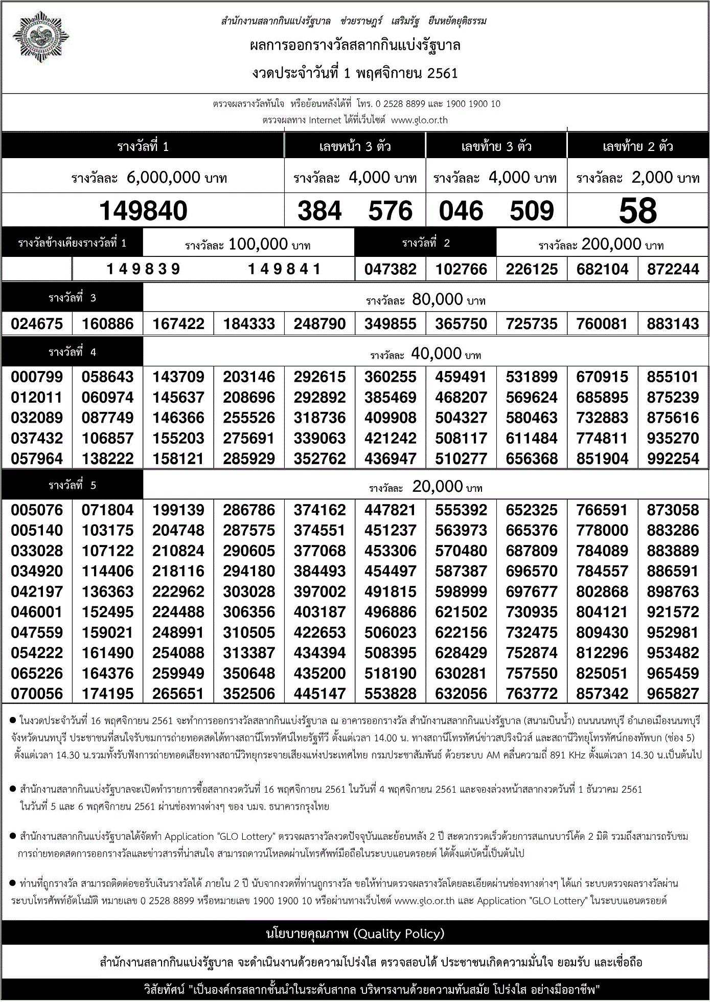 | 1 พฤศจิกายน 2561 | ใบตรวจหวย | 149840 | 046 509 | 58 | 384 576 |