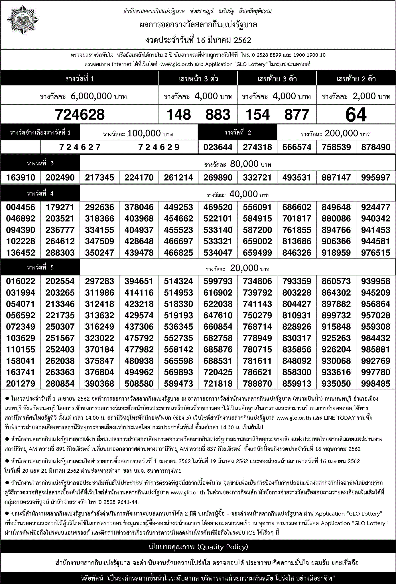 ชื่อเรื่อง:เว็บบริการตรวจผลสลากกินแบ่งรัฐบาลออนไลน์ งวดประจำวันที่ 16/3/62 ตรวจหวย เลขที่ออก 16/03/62