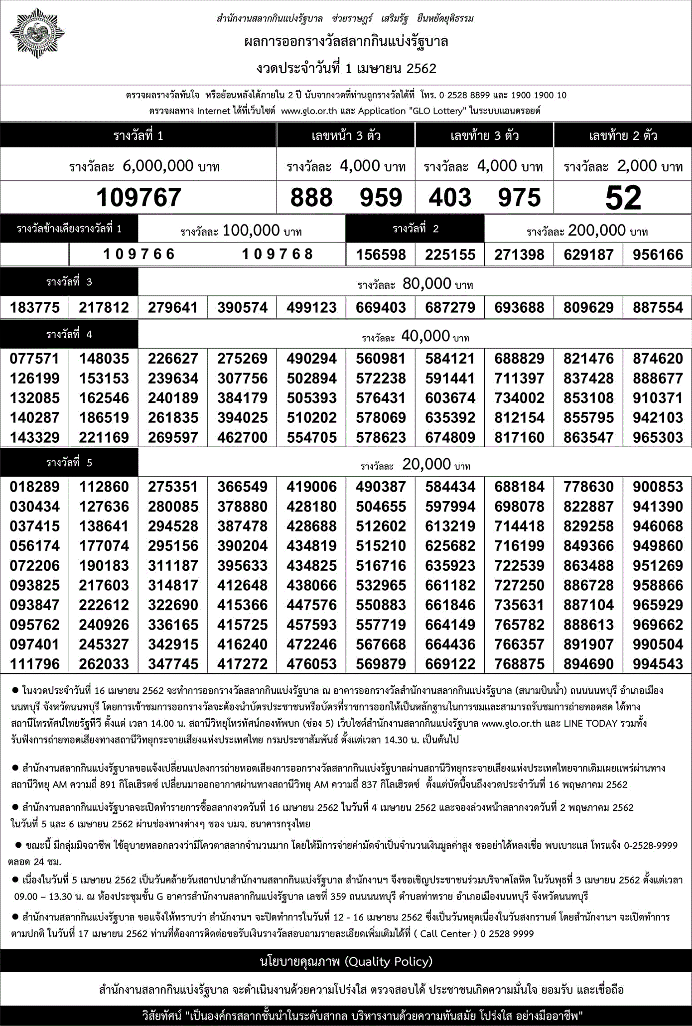 | 1 เมษายน 2562 | ใบตรวจหวย | 109767 | 403 975 | 52 | 888 959 |