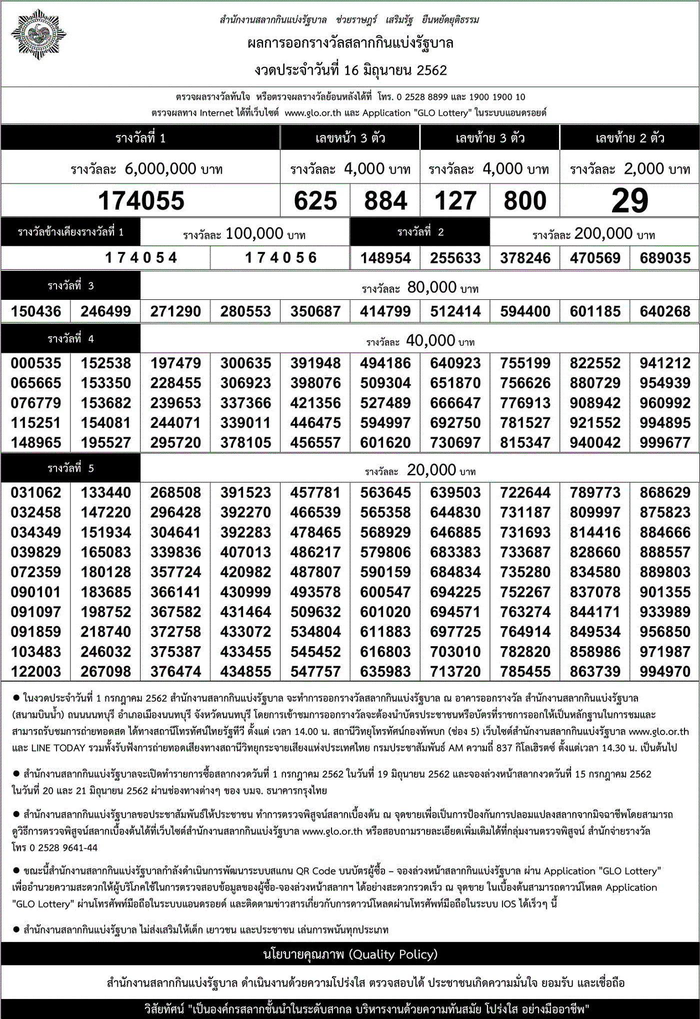 ตรวจหวย ตรวจผลสลากกินแบ่งรัฐบาล 16 มิถุนายน 2562 ใบตรวจหวย 16/6/62