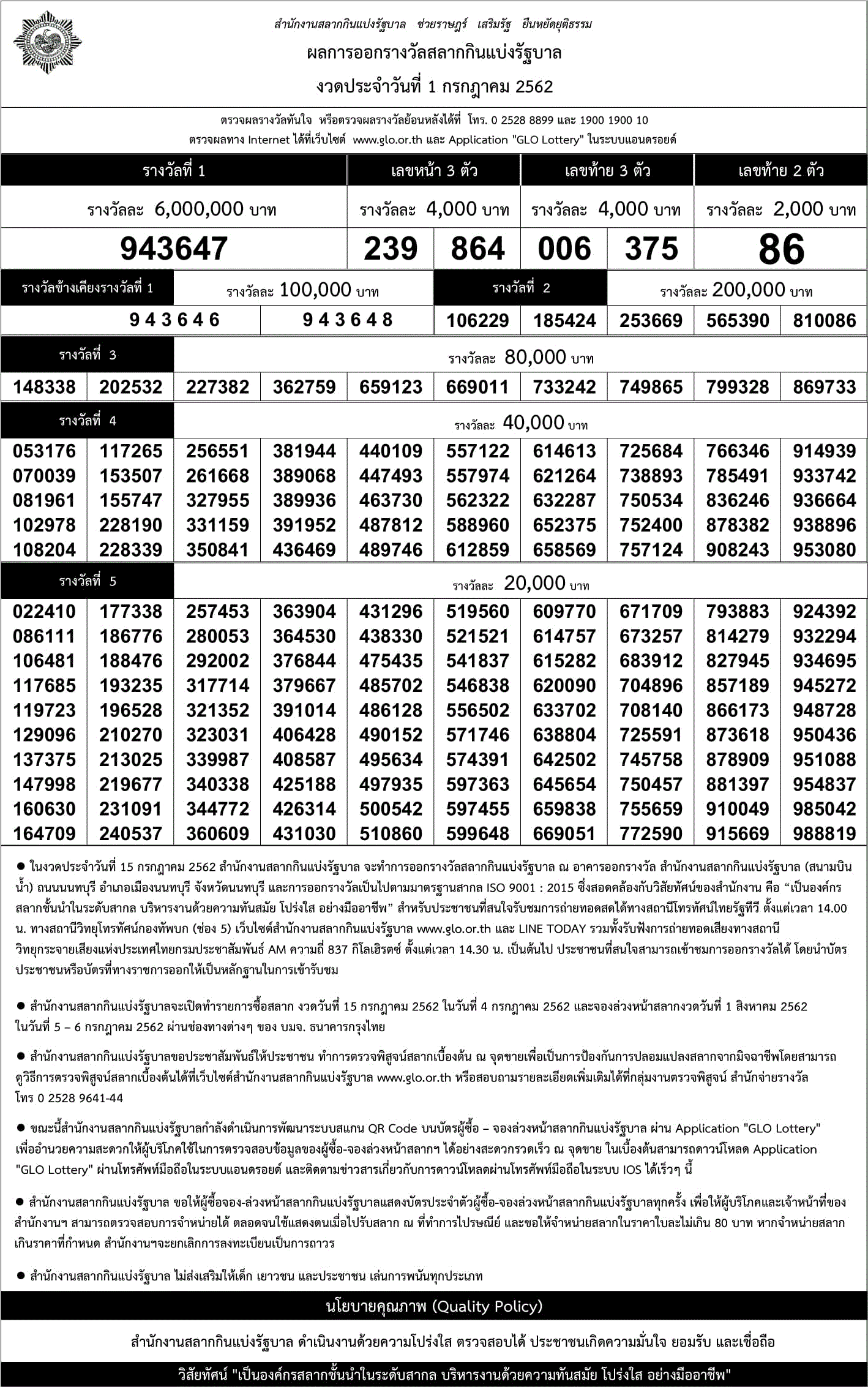 ชื่อเรื่อง:เว็บบริการตรวจผลสลากกินแบ่งรัฐบาลออนไลน์ งวดประจำวันที่ 1/7/62 ตรวจหวย เลขที่ออก 1/07/62