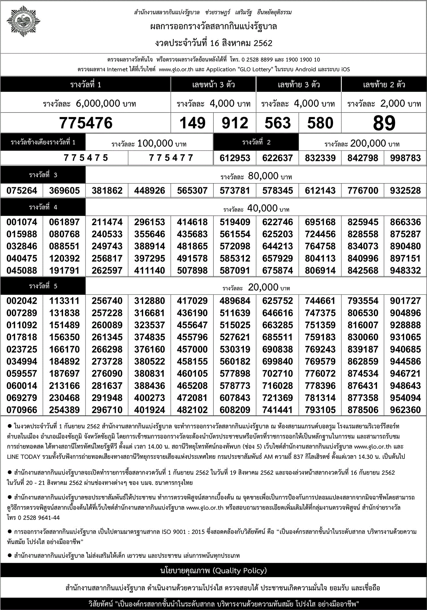 ==ผลสลากกินแบ่งรัฐบาล 16 สิงหาคม 2562==