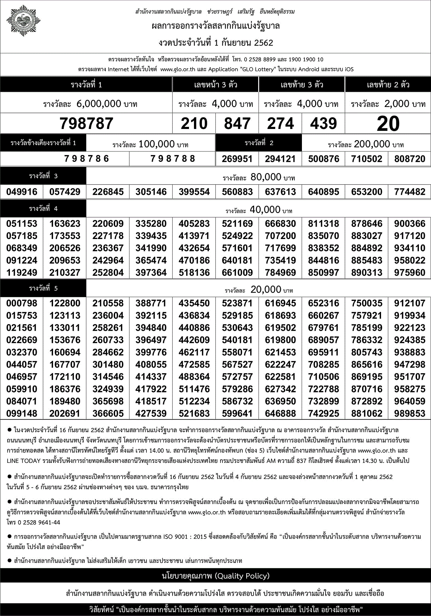 ตรวจหวย ตรวจผลสลากกินแบ่งรัฐบาล 1 กันยายน 2562 ใบตรวจหวย 1/9/62
