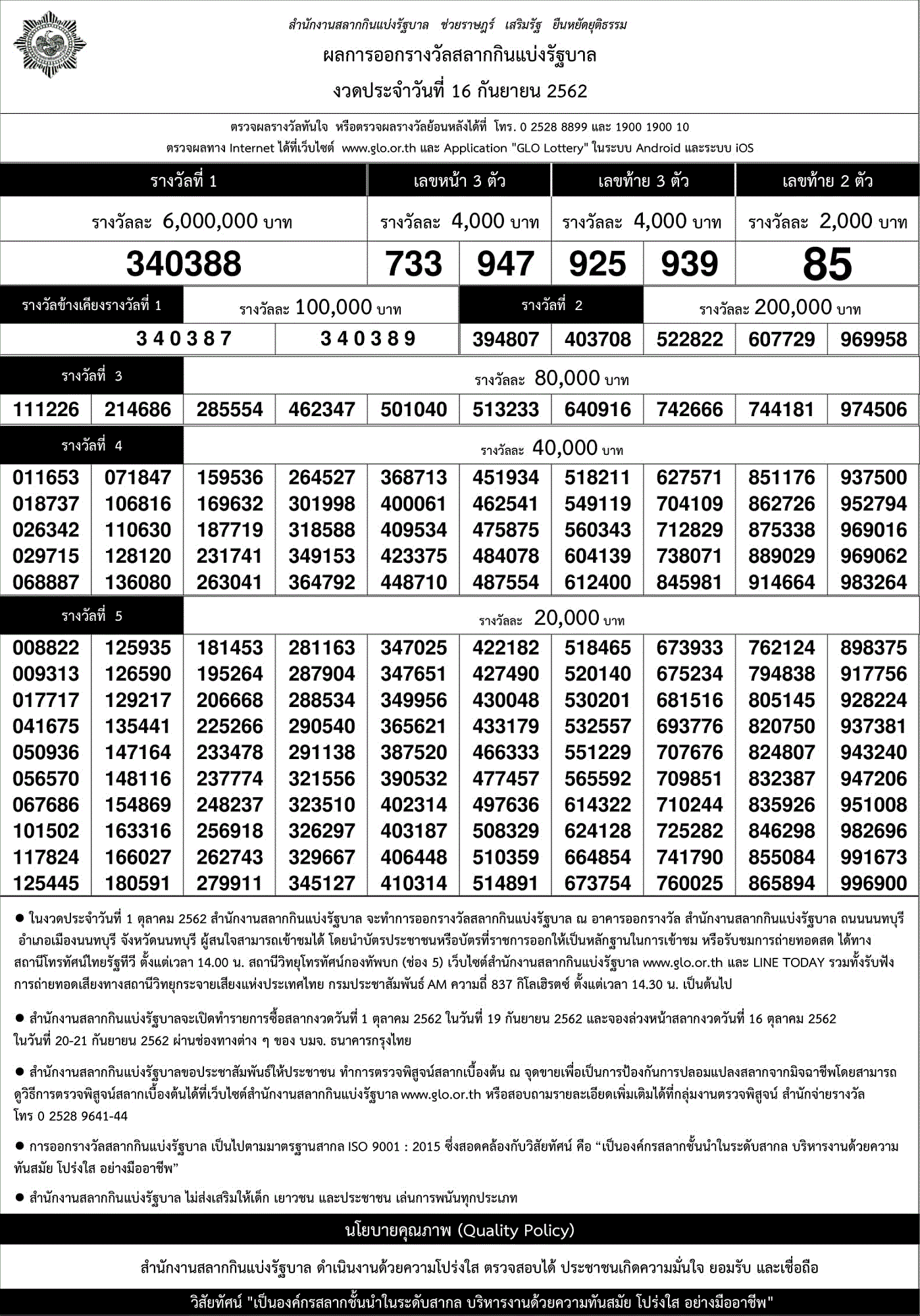 ==ผลสลากกินแบ่งรัฐบาล 16 กันยายน 2562==