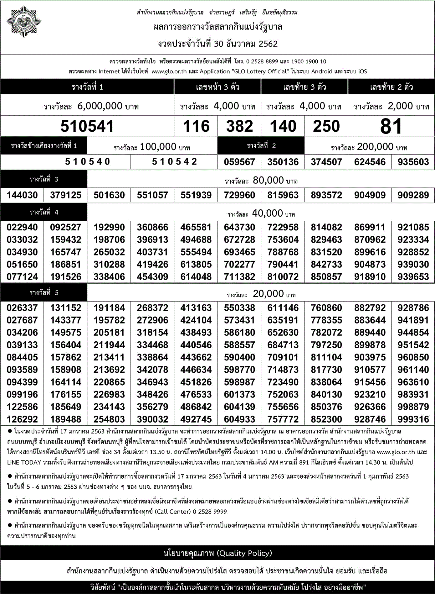 | 30 ธันวาคม 2562 | ใบตรวจหวย | 510541 | 140 250 | 81 | 116 382 |
