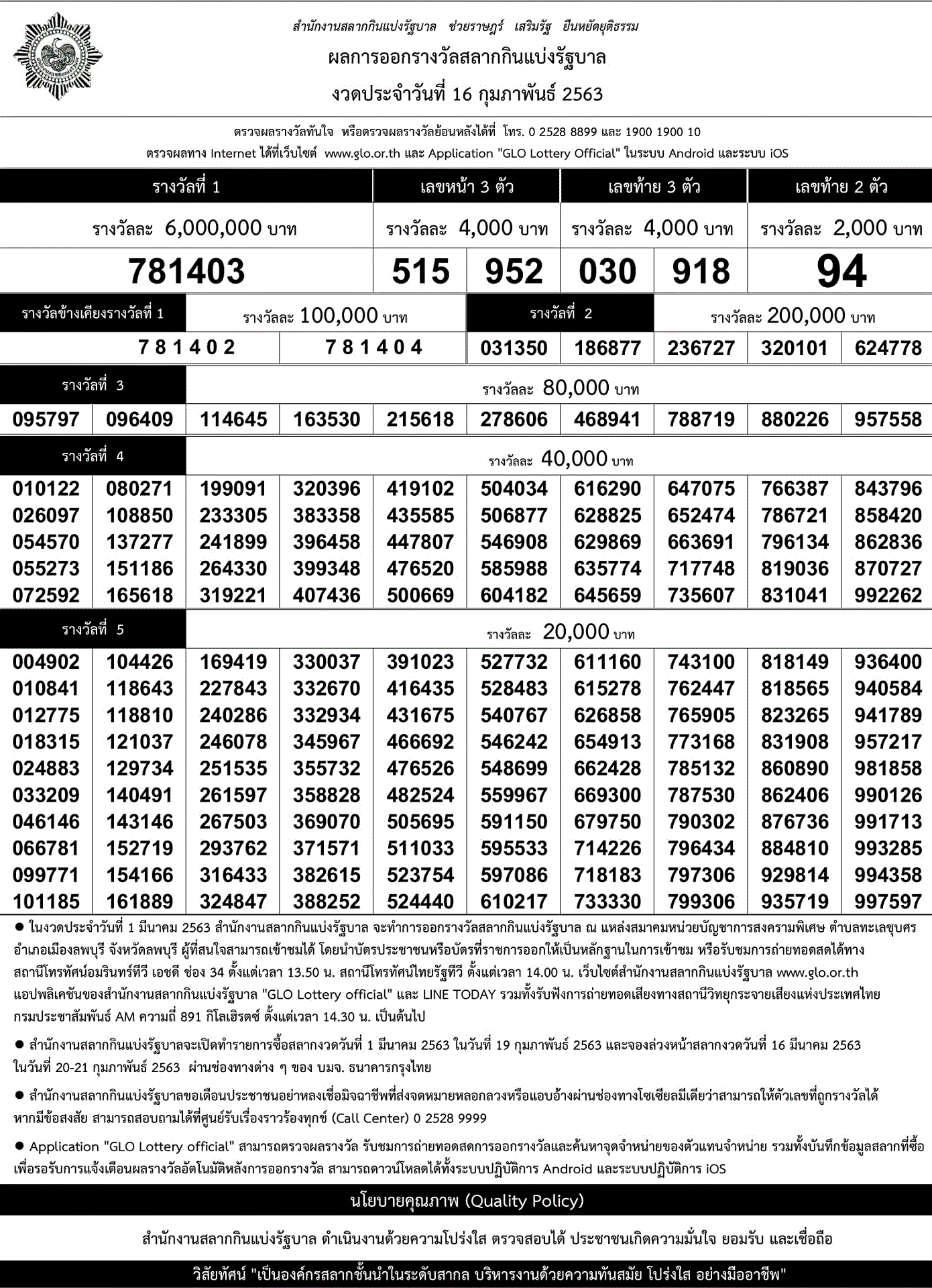 ชื่อเรื่อง:เว็บบริการตรวจผลสลากกินแบ่งรัฐบาลออนไลน์ งวดประจำวันที่ 16/2/63 ตรวจหวย เลขที่ออก 16/02/63