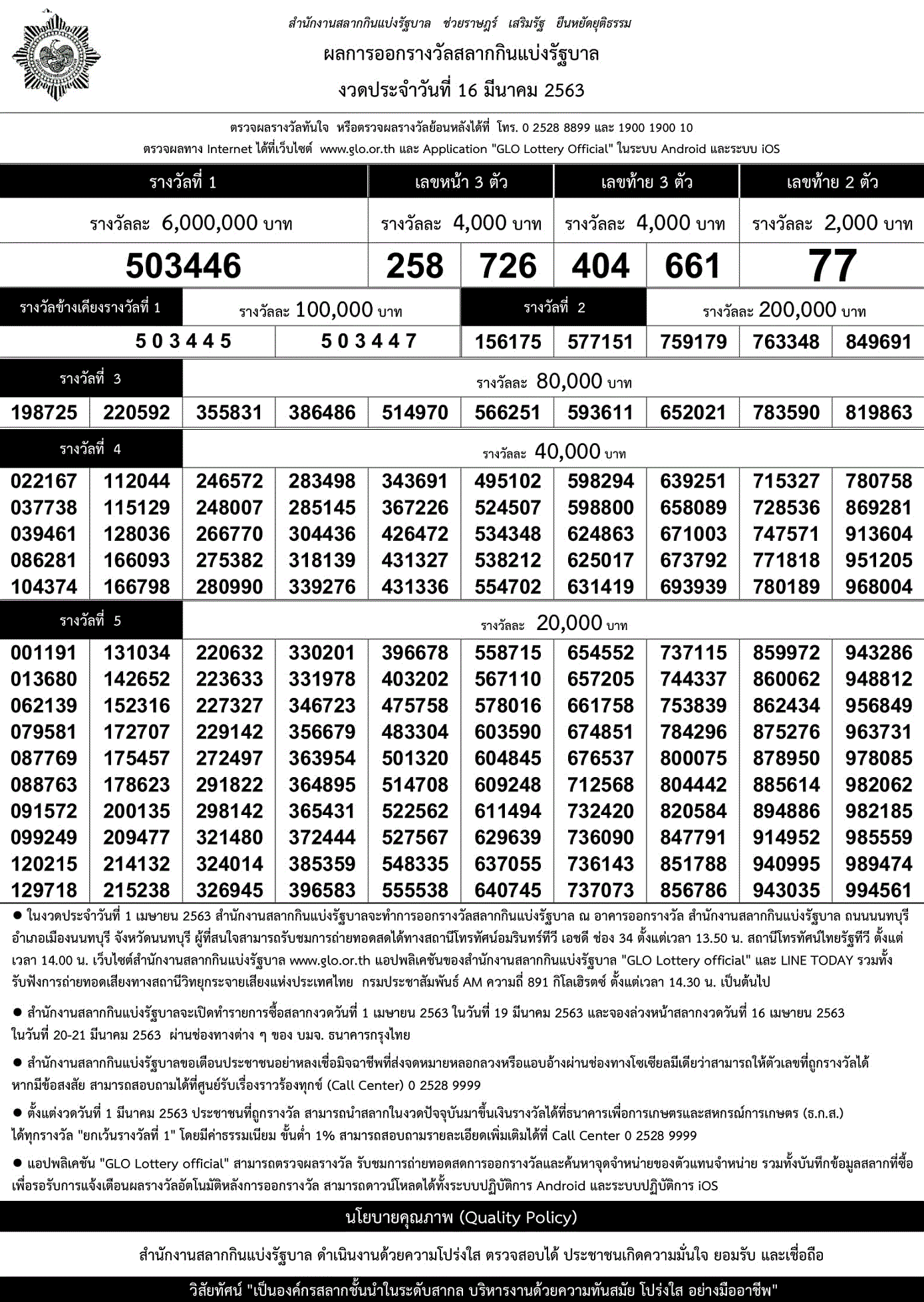 | 16 มีนาคม 2563 | ใบตรวจหวย | 503446 | 661 404 | 77 | 726 258 |