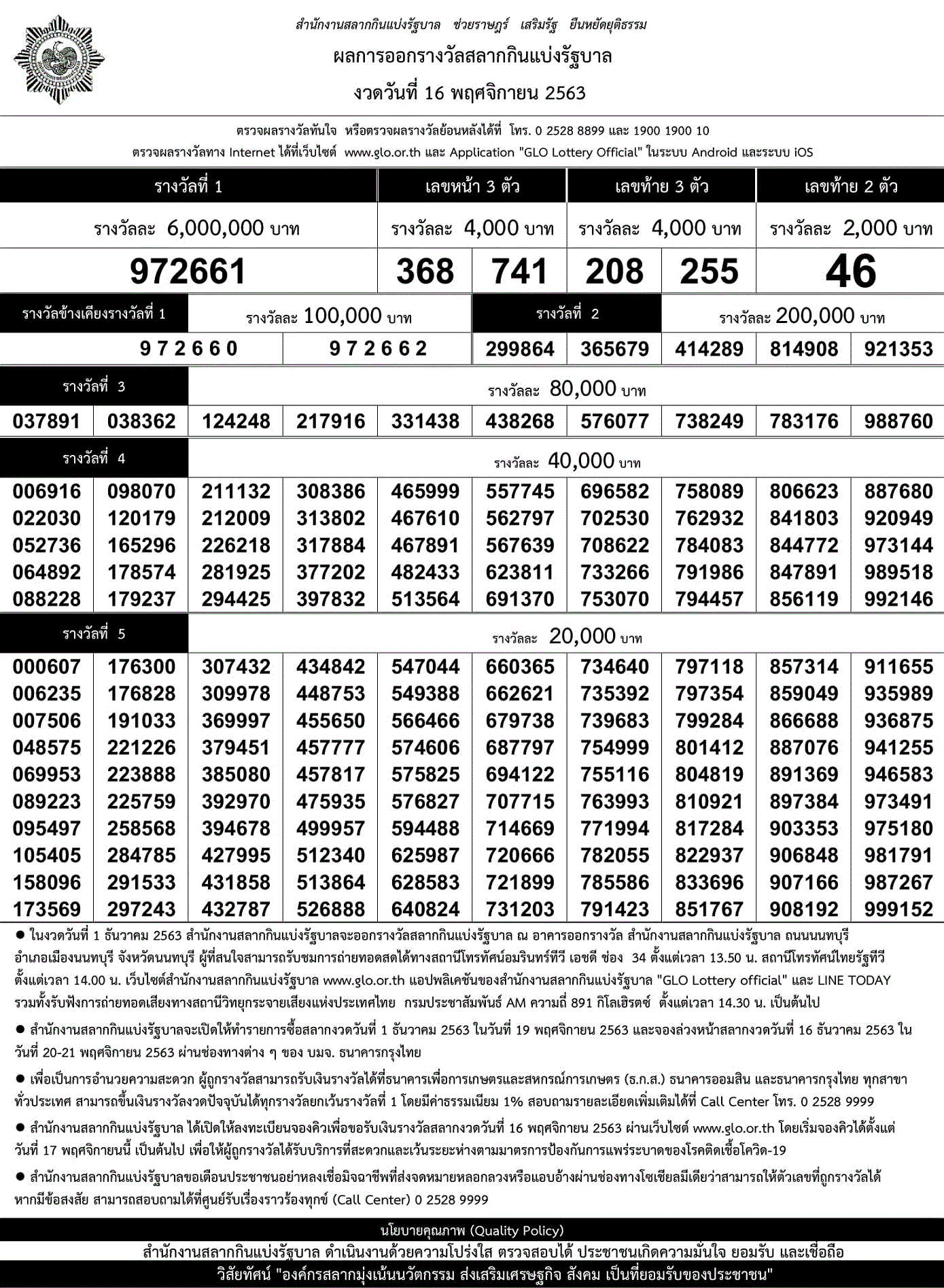 | 16 พฤศจิกายน 2563 | ใบตรวจหวย | 972661 | 208 255 | 46 | 368 741 |