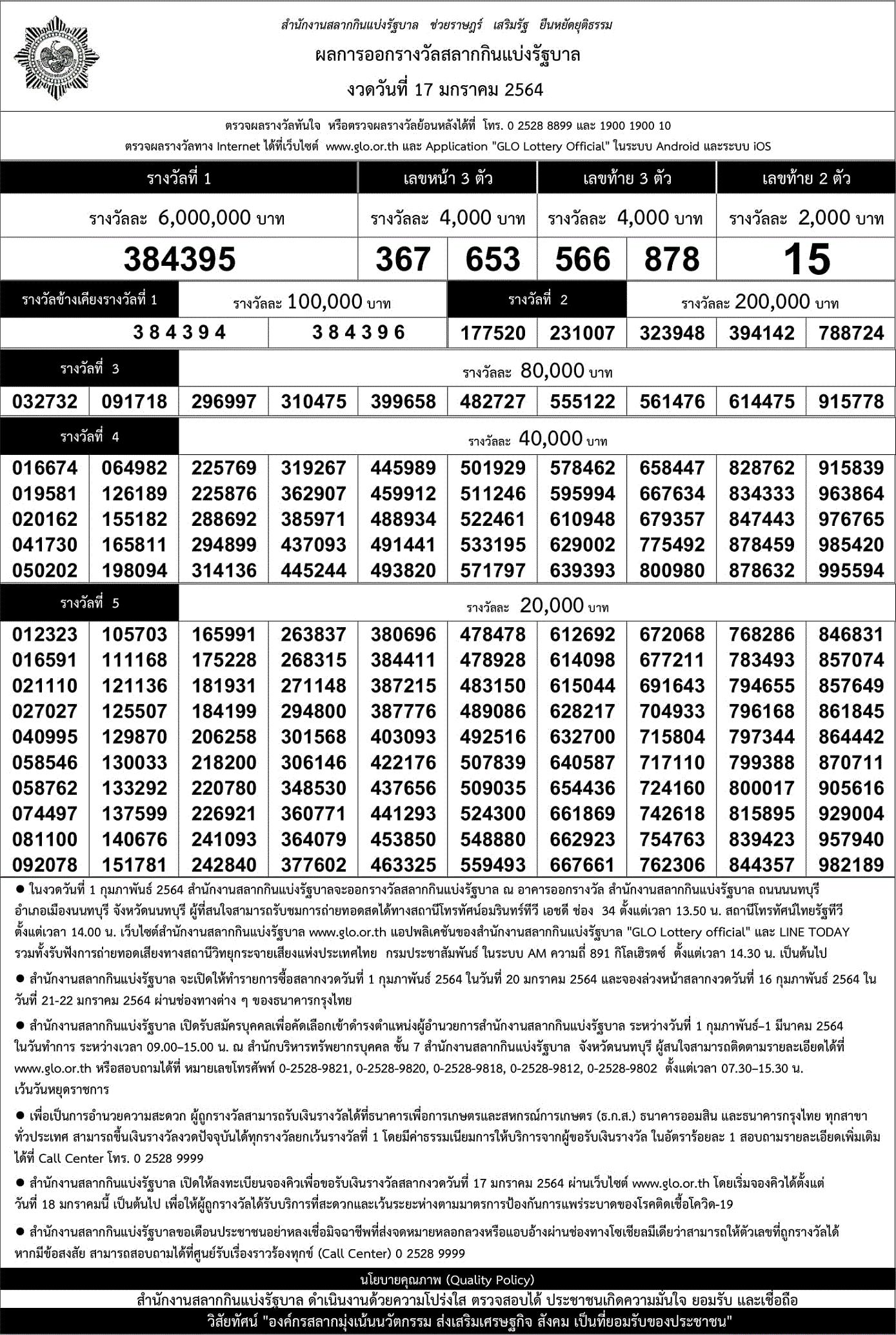 | 17 มกราคม 2564 | ใบตรวจหวย | 384395 | 566 878 | 15 | 367 653 |