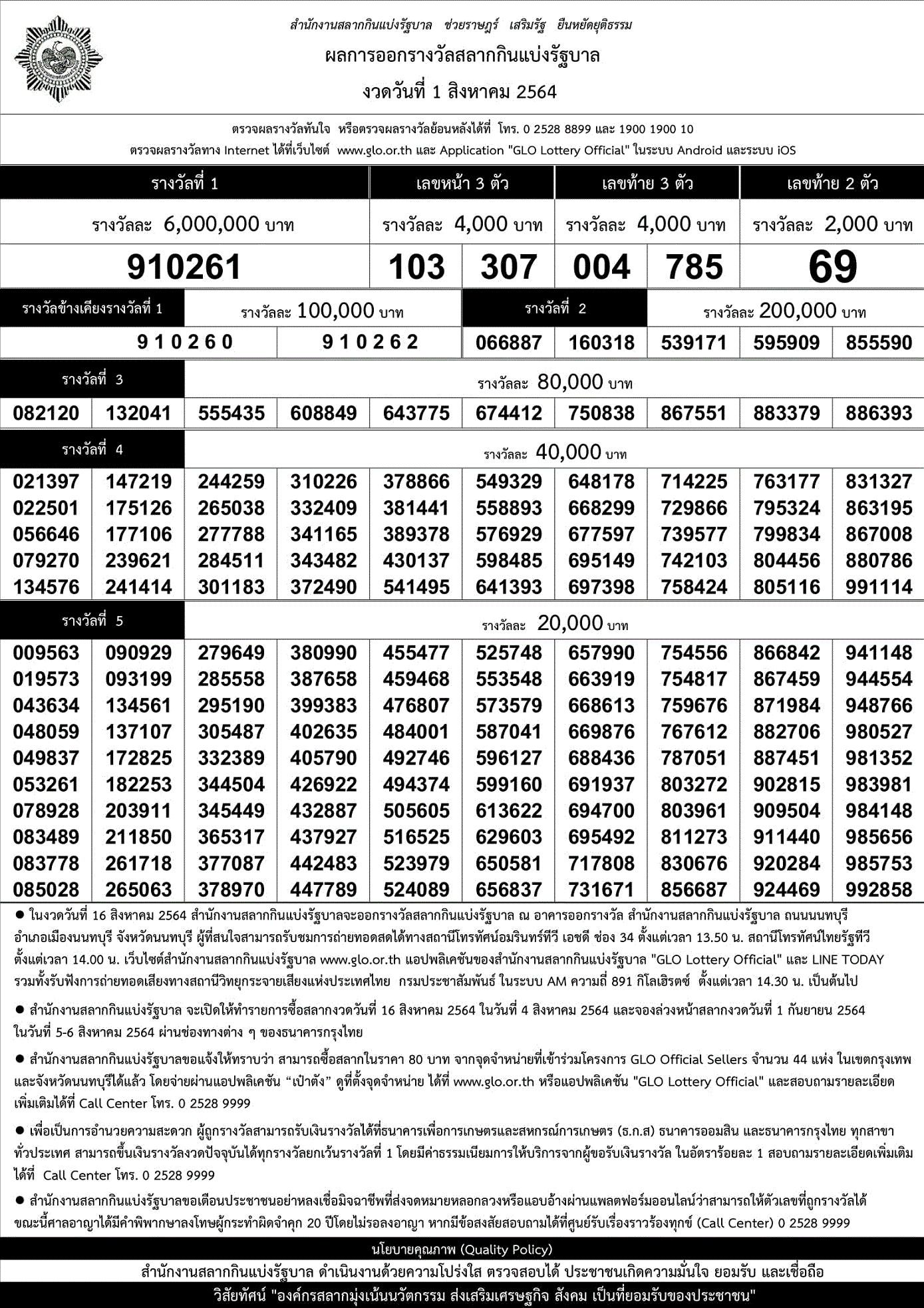 ชื่อเรื่อง:เว็บบริการตรวจผลสลากกินแบ่งรัฐบาลออนไลน์ งวดประจำวันที่ 1/8/64 ตรวจหวย เลขที่ออก 1/08/64