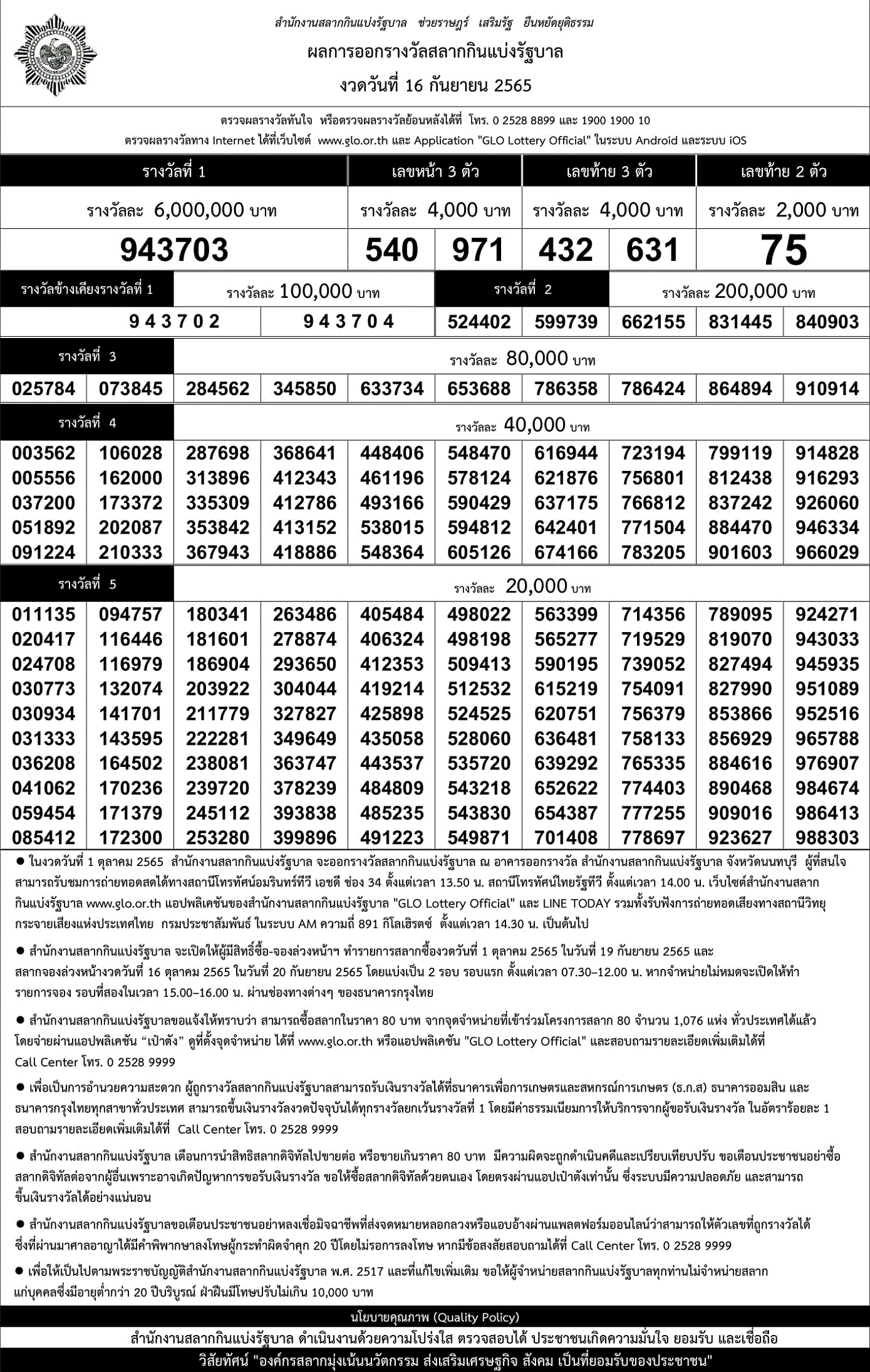 | 16 กันยายน 2565 | ใบตรวจหวย | 943703 | 631 432 | 75 | 971 540 |