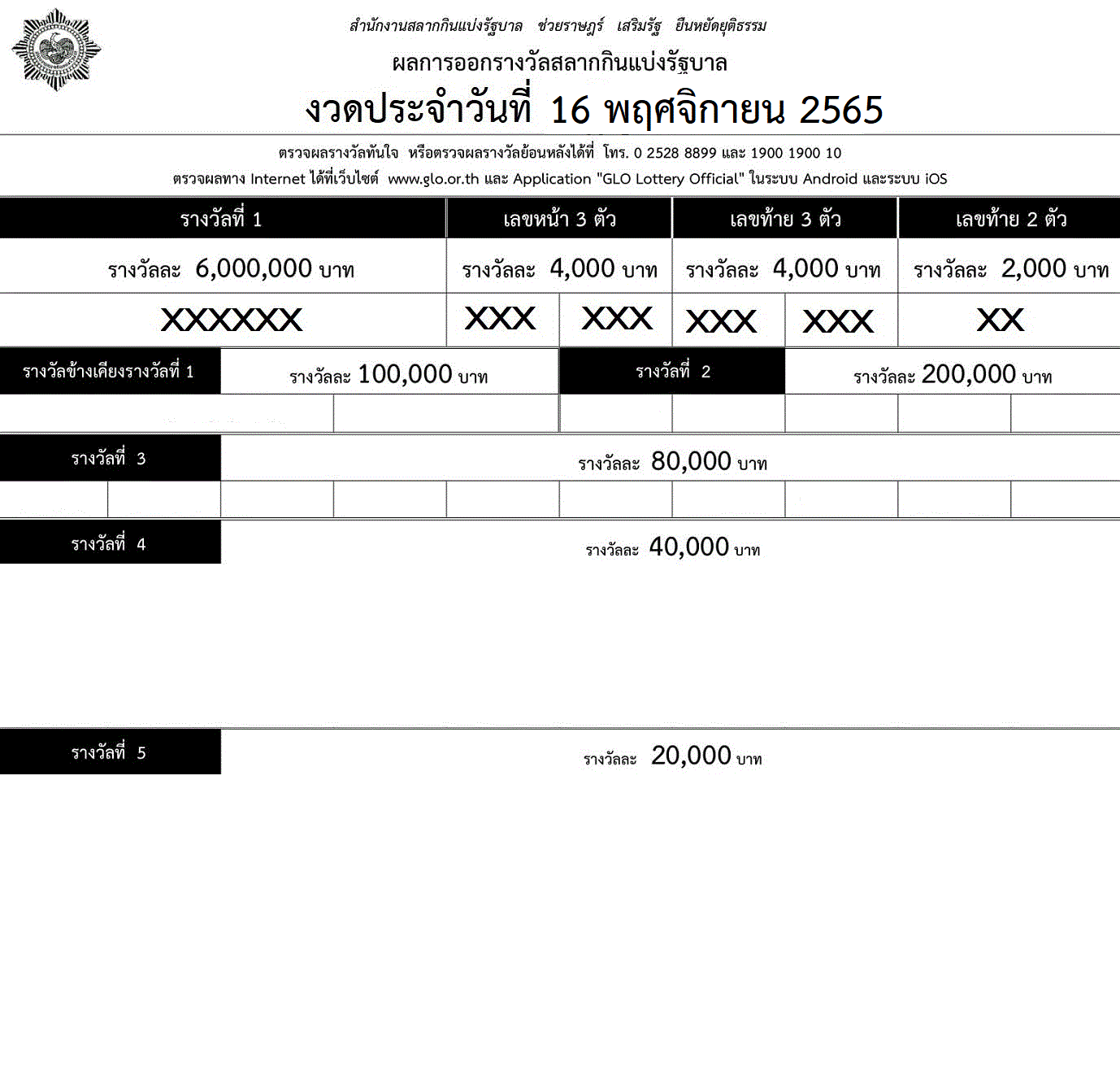 | 16 พฤศจิกายน 2565 | ใบตรวจหวย | xxxxxx | xxx xxx | xx | xxx xxx |